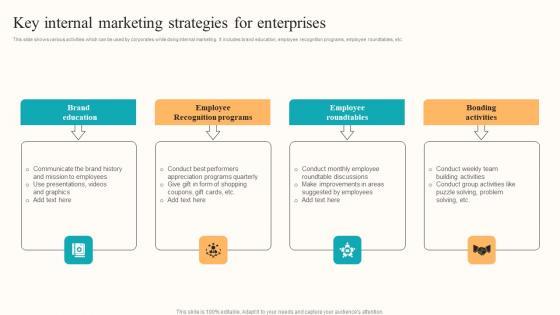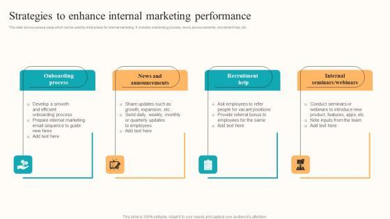 This slide shows various ways which can be used by enterprises for internal marketing. It includes onboarding process, news, announcements, recruitment help, etc. Presenting this PowerPoint presentation, titled Strategies Enhance Internal Developing Employee Centric Marketing Program Portrait Pdf, with topics curated by our researchers after extensive research. This editable presentation is available for immediate download and provides attractive features when used. Download now and captivate your audience. Presenting this Strategies Enhance Internal Developing Employee Centric Marketing Program Portrait Pdf. Our researchers have carefully researched and created these slides with all aspects taken into consideration. This is a completely customizable Strategies Enhance Internal Developing Employee Centric Marketing Program Portrait Pdf that is available for immediate downloading. Download now and make an impact on your audience. Highlight the attractive features available with our PPTs. This slide shows various ways which can be used by enterprises for internal marketing. It includes onboarding process, news, announcements, recruitment help, etc.