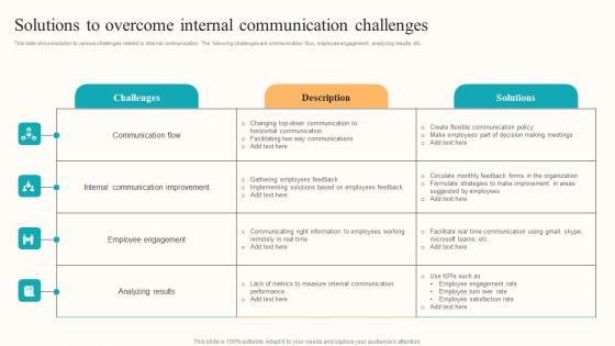 This slide shows solution to various challenges related to internal communication. The following challenges are communication flow, employee engagement, analyzing results, etc. Retrieve professionally designed Solutions Overcome Internal Developing Employee Centric Marketing Program Ideas Pdf to effectively convey your message and captivate your listeners. Save time by selecting pre made slideshows that are appropriate for various topics, from business to educational purposes. These themes come in many different styles, from creative to corporate, and all of them are easily adjustable and can be edited quickly. Access them as PowerPoint templates or as Google Slides themes. You do not have to go on a hunt for the perfect presentation because Slidegeeks got you covered from everywhere. This slide shows solution to various challenges related to internal communication. The following challenges are communication flow, employee engagement, analyzing results, etc.