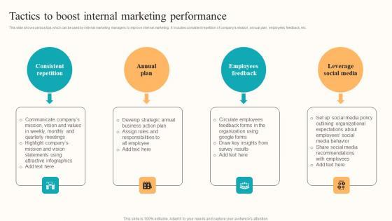 This slide shows various tips which can be used by internal marketing managers to improve internal marketing. It includes consistent repetition of companys mission, annual plan, employees feedback, etc. This Tactics Boost Internal Marketing Developing Employee Centric Marketing Program Background Pdf from Slidegeeks makes it easy to present information on your topic with precision. It provides customization options, so you can make changes to the colors, design, graphics, or any other component to create a unique layout. It is also available for immediate download, so you can begin using it right away. Slidegeeks has done good research to ensure that you have everything you need to make your presentation stand out. Make a name out there for a brilliant performance. This slide shows various tips which can be used by internal marketing managers to improve internal marketing. It includes consistent repetition of companys mission, annual plan, employees feedback, etc.