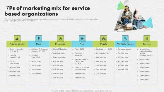 This slide shows various Ps which can be used by organizations in marketing their services. It includes product service, place, promotion, price, people, physical evidence and process. This 7Ps Of Marketing Mix Service Developing An Impactful SEO Marketing Plan Graphics Pdf from Slidegeeks makes it easy to present information on your topic with precision. It provides customization options, so you can make changes to the colors, design, graphics, or any other component to create a unique layout. It is also available for immediate download, so you can begin using it right away. Slidegeeks has done good research to ensure that you have everything you need to make your presentation stand out. Make a name out there for a brilliant performance. This slide shows various Ps which can be used by organizations in marketing their services. It includes product service, place, promotion, price, people, physical evidence and process.