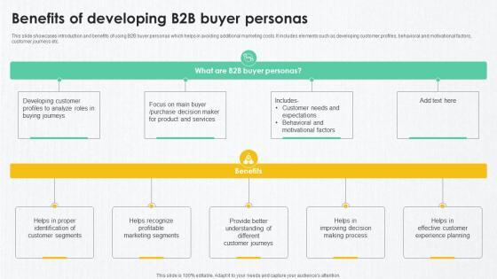 This slide showcases introduction and benefits of using B2B buyer personas which helps in avoiding additional marketing costs. It includes elements such as developing customer profiles, behavioral and motivational factors, customer journeys etc. Slidegeeks is here to make your presentations a breeze with B2B Marketing Techniques Benefits Of Developing B2B Buyer Personas With our easy-to-use and customizable templates, you can focus on delivering your ideas rather than worrying about formatting. With a variety of designs to choose from, you are sure to find one that suits your needs. And with animations and unique photos, illustrations, and fonts, you can make your presentation pop. So whether you are giving a sales pitch or presenting to the board, make sure to check out Slidegeeks first This slide showcases introduction and benefits of using B2B buyer personas which helps in avoiding additional marketing costs. It includes elements such as developing customer profiles, behavioral and motivational factors, customer journeys etc.