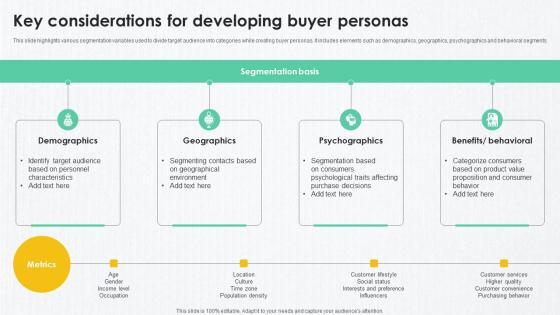 This slide highlights various segmentation variables used to divide target audience into categories while creating buyer personas. It includes elements such as demographics, geographics, psychographics and behavioral segments. Create an editable B2B Marketing Techniques Key Considerations For Developing Buyer Personas that communicates your idea and engages your audience. Whether you are presenting a business or an educational presentation, pre-designed presentation templates help save time. B2B Marketing Techniques Key Considerations For Developing Buyer Personas is highly customizable and very easy to edit, covering many different styles from creative to business presentations. Slidegeeks has creative team members who have crafted amazing templates. So, go and get them without any delay. This slide highlights various segmentation variables used to divide target audience into categories while creating buyer personas. It includes elements such as demographics, geographics, psychographics and behavioral segments.