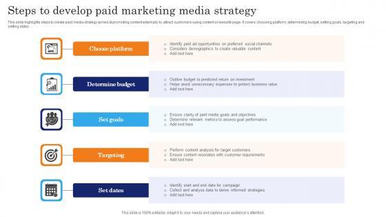 This slide highlights steps to create paid media strategy aimed at promoting content externally to attract customers using content or website page. It covers choosing platform, determining budget, setting goals, targeting and setting dates Showcasing this set of slides titled Steps To Develop Paid Marketing Media Strategy Microsoft Pdf. The topics addressed in these templates are Choose Platform, Determine Budget, Set Goals. All the content presented in this PPT design is completely editable. Download it and make adjustments in color, background, font etc. as per your unique business setting. This slide highlights steps to create paid media strategy aimed at promoting content externally to attract customers using content or website page. It covers choosing platform, determining budget, setting goals, targeting and setting dates