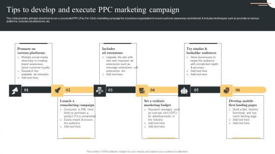 This slide provides glimpse about how to run a successful PPC Pay Per Click marketing campaign for a business organization to boost customer awareness and interest. It includes techniques such as promote on various platforms, includes ad extensions, etc. Slidegeeks has constructed Tips To Develop And Execute Comprehensive Guide For Paid Media Marketing Strategies Topics Pdf after conducting extensive research and examination. These presentation templates are constantly being generated and modified based on user preferences and critiques from editors. Here, you will find the most attractive templates for a range of purposes while taking into account ratings and remarks from users regarding the content. This is an excellent jumping off point to explore our content and will give new users an insight into our top notch PowerPoint Templates. This slide provides glimpse about how to run a successful PPC Pay Per Click marketing campaign for a business organization to boost customer awareness and interest. It includes techniques such as promote on various platforms, includes ad extensions, etc.