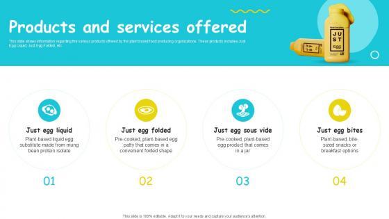This slide shows information regarding the various products offered by the plant based food producing organizations. These products includes Just Egg Liquid, Just Egg Folded, etc. The best PPT templates are a great way to save time, energy, and resources. Slidegeeks have 100 percent editable powerpoint slides making them incredibly versatile. With these quality presentation templates, you can create a captivating and memorable presentation by combining visually appealing slides and effectively communicating your message. Download Products And Services Offered Plant Based Eggs Developing Company Investor PPT PowerPoint from Slidegeeks and deliver a wonderful presentation. This slide shows information regarding the various products offered by the plant based food producing organizations. These products includes Just Egg Liquid, Just Egg Folded, etc.