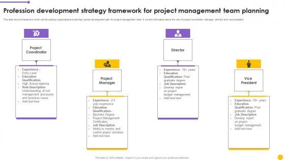 This slide shows framework which can be used by organizations to develop career development plan for project management team. It covers information about the role of project coordinator, manager, director and vice president. Showcasing this set of slides titled Profession Development Strategy Framework For Project Management Team Planning Sample Pdf. The topics addressed in these templates are Project Coordinator, Project Manager, Director. All the content presented in this PPT design is completely editable. Download it and make adjustments in color, background, font etc. as per your unique business setting. This slide shows framework which can be used by organizations to develop career development plan for project management team. It covers information about the role of project coordinator, manager, director and vice president.