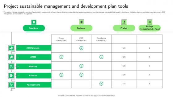 This slide provides a comparative analysis of sustainability management software that monitors non renewable energy sources, minimizes operational costs, and establishes regulatory compliance. It includes features such as energy management, ESG management, and compliance management. Showcasing this set of slides titled Project Sustainable Management And Development Plan Tools Information Pdf. The topics addressed in these templates are CEMS, Mapistry, Enablon . All the content presented in this PPT design is completely editable. Download it and make adjustments in color, background, font etc. as per your unique business setting. This slide provides a comparative analysis of sustainability management software that monitors non renewable energy sources, minimizes operational costs, and establishes regulatory compliance. It includes features such as energy management, ESG management, and compliance management.