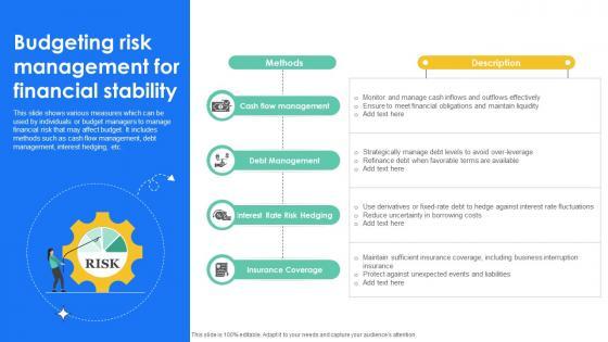 This slide shows various measures which can be used by individuals or budget managers to manage financial risk that may affect budget. It includes methods such as cash flow management, debt management, interest hedging, etc. Want to ace your presentation in front of a live audience Our Budgeting Risk Management For Financial Effective And Efficient Tools To Develop Fin SS V can help you do that by engaging all the users towards you. Slidegeeks experts have put their efforts and expertise into creating these impeccable powerpoint presentations so that you can communicate your ideas clearly. Moreover, all the templates are customizable, and easy-to-edit and downloadable. Use these for both personal and commercial use. This slide shows various measures which can be used by individuals or budget managers to manage financial risk that may affect budget. It includes methods such as cash flow management, debt management, interest hedging, etc.