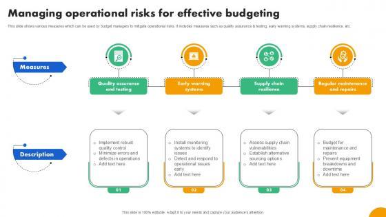 This slide shows various measures which can be used by budget managers to mitigate operational risks. It includes measures such as quality assurance and testing, early warning systems, supply chain resilience, etc. This Managing Operational Risks For Strategies To Develop Effective Ppt Example Fin SS V is perfect for any presentation, be it in front of clients or colleagues. It is a versatile and stylish solution for organizing your meetings. The Managing Operational Risks For Strategies To Develop Effective Ppt Example Fin SS V features a modern design for your presentation meetings. The adjustable and customizable slides provide unlimited possibilities for acing up your presentation. Slidegeeks has done all the homework before launching the product for you. So, do not wait, grab the presentation templates today This slide shows various measures which can be used by budget managers to mitigate operational risks. It includes measures such as quality assurance and testing, early warning systems, supply chain resilience, etc.