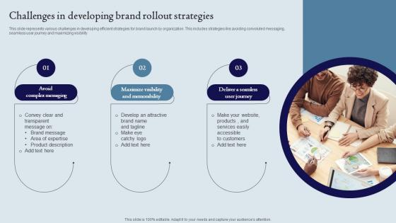 This slide represents various challenges in developing efficient strategies for brand launch by organization. This includes strategies like avoiding convoluted messaging, seamless user journey and maximizing visibility. Showcasing this set of slides titled Challenges In Developing Brand Rollout Strategies Ppt Layouts Graphics Template Pdf. The topics addressed in these templates are Avoid Complex Messaging, Maximize Visibility, Deliver Seamless, User Journey. All the content presented in this PPT design is completely editable. Download it and make adjustments in color, background, font etc. as per your unique business setting. This slide represents various challenges in developing efficient strategies for brand launch by organization. This includes strategies like avoiding convoluted messaging, seamless user journey and maximizing visibility.