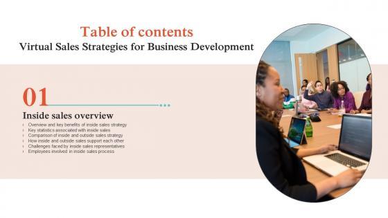 Slidegeeks is one of the best resources for PowerPoint templates. You can download easily and regulate Table Of Contents Virtual Sales Strategies For Business Development Strategy SS V for your personal presentations from our wonderful collection. A few clicks is all it takes to discover and get the most relevant and appropriate templates. Use our Templates to add a unique zing and appeal to your presentation and meetings. All the slides are easy to edit and you can use them even for advertisement purposes. Our Table Of Contents Virtual Sales Strategies For Business Development Strategy SS V are topically designed to provide an attractive backdrop to any subject. Use them to look like a presentation pro.