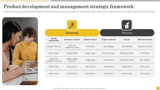 This slide provides two-part product development and management framework that focuses on product discovery and delivery. It includes identify problems, brainstorm solutions, validates solutions, scope and estimate, execute and, measuring and iteration. Presenting Product Development And Management Strategic Framework Demonstration PDF to dispense important information. This template comprises one stages. It also presents valuable insights into the topics including Identify Opportunities, Brainstorm Solution, Validate Solution. This is a completely customizable PowerPoint theme that can be put to use immediately. So, download it and address the topic impactfully.