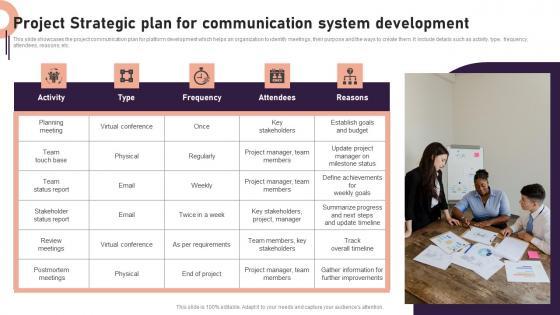 This slide showcases the project communication plan for platform development which helps an organization to identify meetings, their purpose and the ways to create them. It include details such as activity, type, frequency, attendees, reasons, etc. Showcasing this set of slides titled Project Strategic Plan For Communication System Development Ideas Pdf. The topics addressed in these templates are Project Strategic Plan, Communication System Development. All the content presented in this PPT design is completely editable. Download it and make adjustments in color, background, font etc. as per your unique business setting. This slide showcases the project communication plan for platform development which helps an organization to identify meetings, their purpose and the ways to create them. It include details such as activity, type, frequency, attendees, reasons, etc.