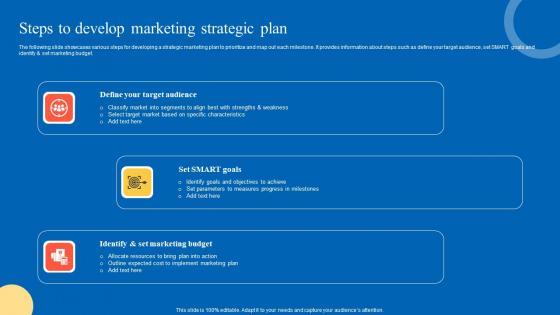 The following slide showcases various steps for developing a strategic marketing plan to prioritize and map out each milestone. It provides information about steps such as define your target audience, set SMART goals and identify and set marketing budget. Find highly impressive Steps To Develop Strategic Guide For Marketing Program Ideas Pdf on Slidegeeks to deliver a meaningful presentation. You can save an ample amount of time using these presentation templates. No need to worry to prepare everything from scratch because Slidegeeks experts have already done a huge research and work for you. You need to download Steps To Develop Strategic Guide For Marketing Program Ideas Pdf for your upcoming presentation. All the presentation templates are 100 percent editable and you can change the color and personalize the content accordingly. Download now. The following slide showcases various steps for developing a strategic marketing plan to prioritize and map out each milestone. It provides information about steps such as define your target audience, set SMART goals and identify and set marketing budget.