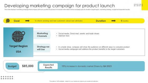 This slide displays marketing campaign that company will run to position its product. It includes information about campaign goal, its duration, target region, marketing strategy, budget and expected results. Are you searching for a Strategic Brand Management Developing Marketing Campaign Ideas Pdf that is uncluttered, straightforward, and original It is easy to edit, and you can change the colors to suit your personal or business branding. For a presentation that expresses how much effort you have put in, this template is ideal With all of its features, including tables, diagrams, statistics, and lists, it is perfect for a business plan presentation. Make your ideas more appealing with these professional slides. Download Strategic Brand Management Developing Marketing Campaign Ideas Pdf from Slidegeeks today. This slide displays marketing campaign that company will run to position its product. It includes information about campaign goal, its duration, target region, marketing strategy, budget and expected results.