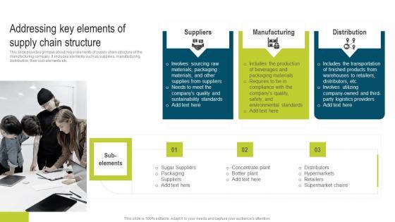 This slide provides glimpse about major elements of supply chain structure of the manufacturing company. It includes elements such as suppliers, manufacturing, distribution, their sub-elements etc. Boost your pitch with our creative Addressing Key Elements Of Supply Chain Developing Extensive Plan For Operational Sample Pdf. Deliver an awe-inspiring pitch that will mesmerize everyone. Using these presentation templates you will surely catch everyones attention. You can browse the ppts collection on our website. We have researchers who are experts at creating the right content for the templates. So you do not have to invest time in any additional work. Just grab the template now and use them. This slide provides glimpse about major elements of supply chain structure of the manufacturing company. It includes elements such as suppliers, manufacturing, distribution, their sub-elements etc.