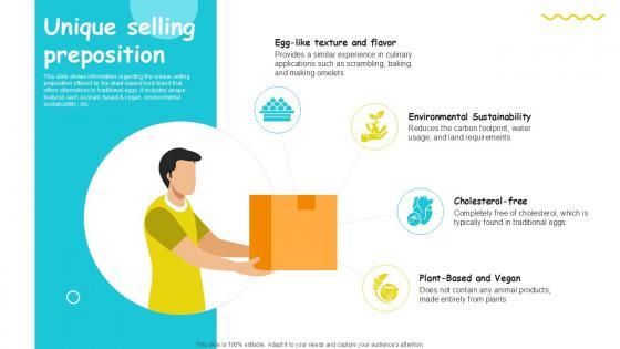 This slide shows information regarding the unique selling preposition offered by the plant-based food brand that offers alternatives to traditional eggs. It includes unique features such as plant based and vegan, environmental sustainability, etc. Slidegeeks has constructed Unique Selling Preposition Plant Based Eggs Developing Company Investor PPT Presentation after conducting extensive research and examination. These presentation templates are constantly being generated and modified based on user preferences and critiques from editors. Here, you will find the most attractive templates for a range of purposes while taking into account ratings and remarks from users regarding the content. This is an excellent jumping-off point to explore our content and will give new users an insight into our top-notch PowerPoint Templates. This slide shows information regarding the unique selling preposition offered by the plant-based food brand that offers alternatives to traditional eggs. It includes unique features such as plant based and vegan, environmental sustainability, etc.