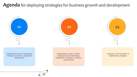 Create an editable Agenda For Deploying Strategies For Business Growth And Development Strategy SS V that communicates your idea and engages your audience. Whether you are presenting a business or an educational presentation, pre-designed presentation templates help save time. Agenda For Deploying Strategies For Business Growth And Development Strategy SS V is highly customizable and very easy to edit, covering many different styles from creative to business presentations. Slidegeeks has creative team members who have crafted amazing templates. So, go and get them without any delay. Our Agenda For Deploying Strategies For Business Growth And Development Strategy SS V are topically designed to provide an attractive backdrop to any subject. Use them to look like a presentation pro.