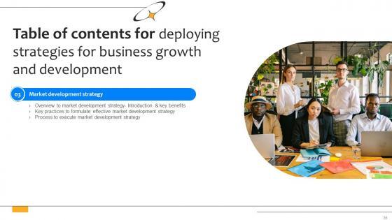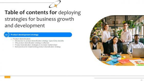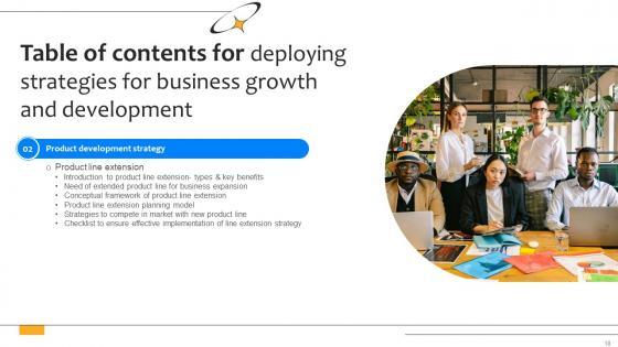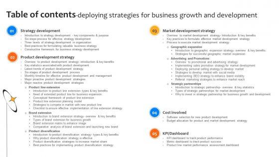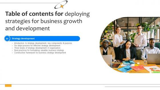 Whether you have daily or monthly meetings, a brilliant presentation is necessary. Table Of Contents Deploying Strategies For Business Growth And Development Strategy SS V can be your best option for delivering a presentation. Represent everything in detail using Table Of Contents Deploying Strategies For Business Growth And Development Strategy SS V and make yourself stand out in meetings. The template is versatile and follows a structure that will cater to your requirements. All the templates prepared by Slidegeeks are easy to download and edit. Our research experts have taken care of the corporate themes as well. So, give it a try and see the results. Our Table Of Contents Deploying Strategies For Business Growth And Development Strategy SS V are topically designed to provide an attractive backdrop to any subject. Use them to look like a presentation pro.