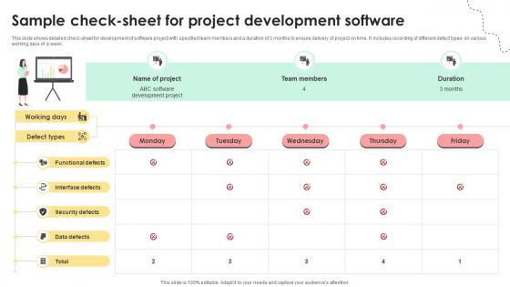 This slide shows detailed check-sheet for development of software project with specified team members and a duration of 3 months to ensure delivery of project on time. It includes recording of different defect types on various working days of a week. Get a simple yet stunning designed Administering Quality Assurance Sample Check Sheet For Project Development Software PM SS V. It is the best one to establish the tone in your meetings. It is an excellent way to make your presentations highly effective. So, download this PPT today from Slidegeeks and see the positive impacts. Our easy-to-edit Administering Quality Assurance Sample Check Sheet For Project Development Software PM SS V can be your go-to option for all upcoming conferences and meetings. So, what are you waiting for Grab this template today. This slide shows detailed check-sheet for development of software project with specified team members and a duration of 3 months to ensure delivery of project on time. It includes recording of different defect types on various working days of a week.