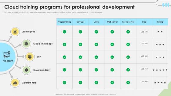 This slide includes cloud training programs for professional development such as learning tree, global knowledge, edX, cloud academy etc. Do you have an important presentation coming up Are you looking for something that will make your presentation stand out from the rest Look no further than Workforce Competency Enhancement Cloud Training Programs For Professional Development DTE SS V. With our professional designs, you can trust that your presentation will pop and make delivering it a smooth process. And with Slidegeeks, you can trust that your presentation will be unique and memorable. So why wait Grab Workforce Competency Enhancement Cloud Training Programs For Professional Development DTE SS V today and make your presentation stand out from the rest This slide includes cloud training programs for professional development such as learning tree, global knowledge, edX, cloud academy etc.