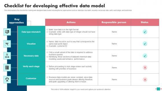 This slide explains the checklist for making well designed data model, including the key approaches such as data type mismatch, visualize, necessary data, verify each stage, and customize. Want to ace your presentation in front of a live audience Our Database Modeling Checklist For Developing Effective Data Model Icons Pdf can help you do that by engaging all the users towards you. Slidegeeks experts have put their efforts and expertise into creating these impeccable powerpoint presentations so that you can communicate your ideas clearly. Moreover, all the templates are customizable, and easy to edit and downloadable. Use these for both personal and commercial use. This slide explains the checklist for making well designed data model, including the key approaches such as data type mismatch, visualize, necessary data, verify each stage, and customize.