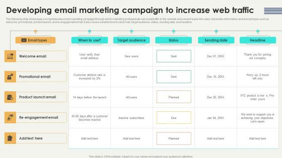 The following slide showcases a comprehensive email marketing campaign through which marketing professionals can boost traffic to the website and convert leads into sales. It provides information about email types such as welcome, promotional, product launch, and re-engagement email. It also covers suitable time to send mail, target audience, status, sending date, and headline. Are you in need of a template that can accommodate all of your creative concepts This one is crafted professionally and can be altered to fit any style. Use it with Google Slides or PowerPoint. Include striking photographs, symbols, depictions, and other visuals. Fill, move around, or remove text boxes as desired. Test out color palettes and font mixtures. Edit and save your work, or work with colleagues. Download Developing Email Marketing Campaign To Increase Web Traffic Ppt PowerPoint Presentation File Diagrams PDF and observe how to make your presentation outstanding. Give an impeccable presentation to your group and make your presentation unforgettable.
