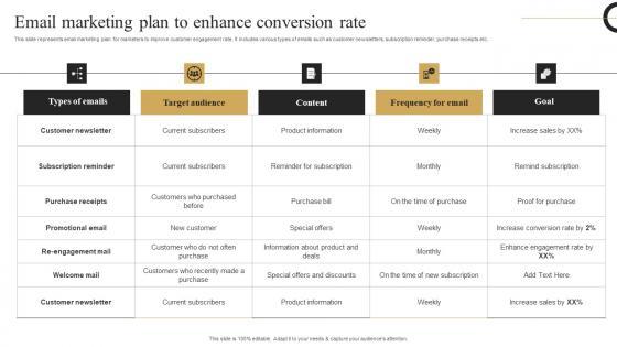 This slide represents email marketing plan for marketers to improve customer engagement rate. It includes various types of emails such as customer newsletters, subscription reminder, purchase receipts etc. Slidegeeks is here to make your presentations a breeze with Email Marketing Plan Enhance Strategic Plan Develop Multi Level Marketing Diagrams Pdf With our easy to use and customizable templates, you can focus on delivering your ideas rather than worrying about formatting. With a variety of designs to choose from, you are sure to find one that suits your needs. And with animations and unique photos, illustrations, and fonts, you can make your presentation pop. So whether you are giving a sales pitch or presenting to the board, make sure to check out Slidegeeks first This slide represents email marketing plan for marketers to improve customer engagement rate. It includes various types of emails such as customer newsletters, subscription reminder, purchase receipts etc.