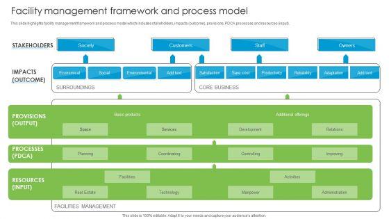 This slide highlights facility management framework and process model which includes stakeholders, impacts outcome, provisions, PDCA processes and resources input. Do you have an important presentation coming up Are you looking for something that will make your presentation stand out from the rest Look no further than Facility Management Framework And Process Model Developing Tactical Fm Services Introduction PDF. With our professional designs, you can trust that your presentation will pop and make delivering it a smooth process. And with Slidegeeks, you can trust that your presentation will be unique and memorable. So why wait Grab Facility Management Framework And Process Model Developing Tactical Fm Services Introduction PDF today and make your presentation stand out from the rest.