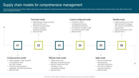 This slide provides glimapse about the multiple supply chain models available for handling business production and other operations. It includes models such as continuous flow model, fast chain model, efficient chain model, custom configured model, etc. Present like a pro with Supply Chain Models For Comprehensive Developing Extensive Plan For Operational Guidelines Pdf Create beautiful presentations together with your team, using our easy-to-use presentation slides. Share your ideas in real-time and make changes on the fly by downloading our templates. So whether you are in the office, on the go, or in a remote location, you can stay in sync with your team and present your ideas with confidence. With Slidegeeks presentation got a whole lot easier. Grab these presentations today. This slide provides glimapse about the multiple supply chain models available for handling business production and other operations. It includes models such as continuous flow model, fast chain model, efficient chain model, custom configured model, etc.