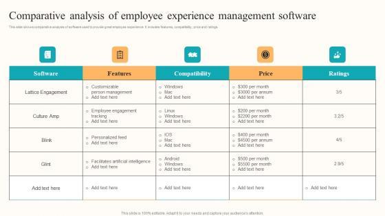 This slide shows comparative analysis of software used to provide great employee experience. It includes features, compatibility, price and ratings. There are so many reasons you need a Comparative Analysis Employee Developing Employee Centric Marketing Program Icons Pdf. The first reason is you can not spend time making everything from scratch, Thus, Slidegeeks has made presentation templates for you too. You can easily download these templates from our website easily. This slide shows comparative analysis of software used to provide great employee experience. It includes features, compatibility, price and ratings.