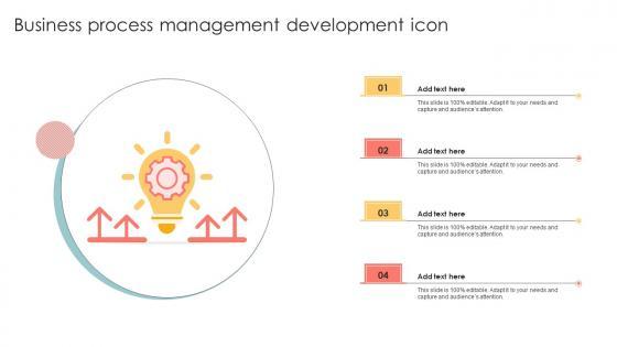Pitch your topic with ease and precision using this Business Process Management Development Icon Formats Pdf. This layout presents information on Business Process, Management Development Icon. It is also available for immediate download and adjustment. So, changes can be made in the color, design, graphics or any other component to create a unique layout. Our Business Process Management Development Icon Formats Pdf are topically designed to provide an attractive backdrop to any subject. Use them to look like a presentation pro.