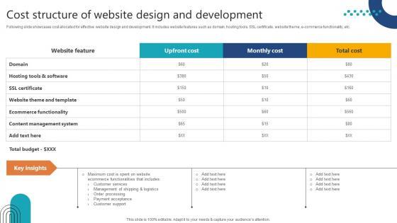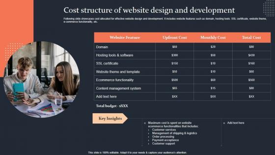 Following slide showcases cost allocated for effective website design and development. It includes website features such as domain, hosting tools. SSL certificate, website theme, e-commerce functionality, etc. Whether you have daily or monthly meetings, a brilliant presentation is necessary. Complete Guide To Launch Cost Structure Of Website Design And Development can be your best option for delivering a presentation. Represent everything in detail using Complete Guide To Launch Cost Structure Of Website Design And Development and make yourself stand out in meetings. The template is versatile and follows a structure that will cater to your requirements. All the templates prepared by Slidegeeks are easy to download and edit. Our research experts have taken care of the corporate themes as well. So, give it a try and see the results. Following slide showcases cost allocated for effective website design and development. It includes website features such as domain, hosting tools. SSL certificate, website theme, e-commerce functionality, etc.