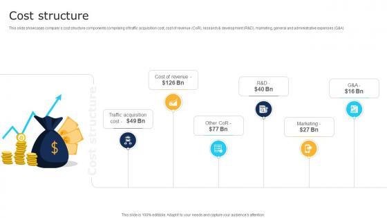 This slide showcases companys cost structure components comprising of traffic acquisition cost, cost of revenue CoR, research and development R and D, marketing, general and administrative expenses G and A. Create an editable Cost Structure Software Development Company Business Model BMC SS V that communicates your idea and engages your audience. Whether you are presenting a business or an educational presentation, pre-designed presentation templates help save time. Cost Structure Software Development Company Business Model BMC SS V is highly customizable and very easy to edit, covering many different styles from creative to business presentations. Slidegeeks has creative team members who have crafted amazing templates. So, go and get them without any delay. This slide showcases companys cost structure components comprising of traffic acquisition cost, cost of revenue CoR, research and development R and D, marketing, general and administrative expenses G and A.