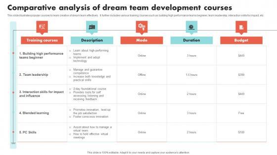 This slide illustrates popular courses to learn creation of dream team effectively. It further includes various training courses such as building high performance teams beginner, team leadership, interaction skills for impact, etc.Pitch your topic with ease and precision using this Comparative Analysis Of Dream Team Development Courses Summary Pdf This layout presents information on Building High Performance, Team Leadership, Interaction Skills It is also available for immediate download and adjustment. So, changes can be made in the color, design, graphics or any other component to create a unique layout. This slide illustrates popular courses to learn creation of dream team effectively. It further includes various training courses such as building high performance teams beginner, team leadership, interaction skills for impact, etc.