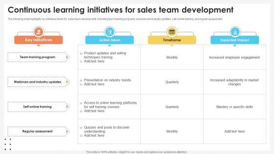 The following slide highlights key initiatives taken for sales team development, including team training programs, webinars and industry updates, self-online training, and regular assessment. Whether you have daily or monthly meetings, a brilliant presentation is necessary. Business Development Team Continuous Learning Initiatives For Sales Team SA SS V can be your best option for delivering a presentation. Represent everything in detail using Business Development Team Continuous Learning Initiatives For Sales Team SA SS V and make yourself stand out in meetings. The template is versatile and follows a structure that will cater to your requirements. All the templates prepared by Slidegeeks are easy to download and edit. Our research experts have taken care of the corporate themes as well. So, give it a try and see the results. The following slide highlights key initiatives taken for sales team development, including team training programs, webinars and industry updates, self-online training, and regular assessment.