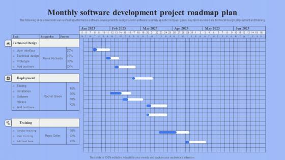 The following slide showcases various tasks performed in software development to design custom software to satisfy specific company goals. Key tasks involved are technical design, deployment and training. Pitch your topic with ease and precision using this Monthly Software Development Project Roadmap Plan Ppt Slides Themes pdf. This layout presents information on Key Tasks Involved, Technical Design, Deployment And Training. It is also available for immediate download and adjustment. So, changes can be made in the color, design, graphics or any other component to create a unique layout. The following slide showcases various tasks performed in software development to design custom software to satisfy specific company goals. Key tasks involved are technical design, deployment and training.