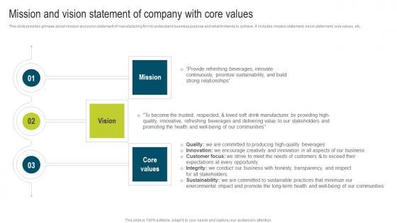 This slide provides glimpse about mission and vision statement of manufacturing firm to understand business purpose and what it intends to achieve. It includes mission statement, vision statement, core values, etc. The Mission And Vision Statement Of Company Developing Extensive Plan For Operational Microsoft Pdf is a compilation of the most recent design trends as a series of slides. It is suitable for any subject or industry presentation, containing attractive visuals and photo spots for businesses to clearly express their messages. This template contains a variety of slides for the user to input data, such as structures to contrast two elements, bullet points, and slides for written information. Slidegeeks is prepared to create an impression. This slide provides glimpse about mission and vision statement of manufacturing firm to understand business purpose and what it intends to achieve. It includes mission statement, vision statement, core values, etc.