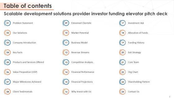 Use this Scalable Development Solutions Provider Investor Funding Elevator Pitch Deck Ppt Template to ensure the business world gets to know you as a presentation expert with tremendous recall value. With its focus on providing the worlds best designs to highlight business ideas that have the potential to change the world, this PPT Template is sure to win you clients. The complete deck in thirty two slides is a compendium of information, structured in a manner that provides the best framework for a presentation. Use this completely editable and customizable presentation to make an impact and improve your order book. Download now. Our Scalable Development Solutions Provider Investor Funding Elevator Pitch Deck Ppt Template are topically designed to provide an attractive backdrop to any subject. Use them to look like a presentation pro.