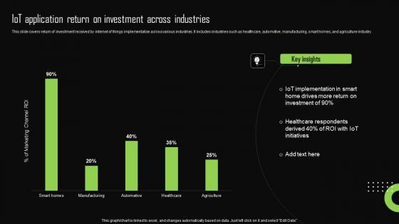 This slide covers return of investment received by internet of things implementation across various industries. It includes industries such as healthcare, automotive, manufacturing, smart homes, and agriculture industry. The best PPT templates are a great way to save time, energy, and resources. Slidegeeks have 100 percent editable powerpoint slides making them incredibly versatile. With these quality presentation templates, you can create a captivating and memorable presentation by combining visually appealing slides and effectively communicating your message. Download IoT Device Management Fundamentals IoT Application Return On Investment Across Industries IoT SS V from Slidegeeks and deliver a wonderful presentation. This slide covers return of investment received by internet of things implementation across various industries. It includes industries such as healthcare, automotive, manufacturing, smart homes, and agriculture industry.