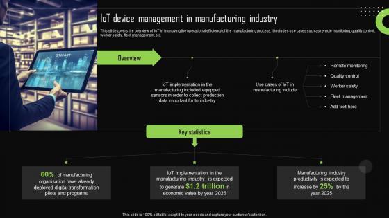 This slide covers the overview of IoT in improving the operational efficiency of the manufacturing process. It includes use cases such as remote monitoring, quality control, worker safety, fleet management, etc. Want to ace your presentation in front of a live audience Our IoT Device Management Fundamentals IoT Device Management In Manufacturing Industry IoT SS V can help you do that by engaging all the users towards you. Slidegeeks experts have put their efforts and expertise into creating these impeccable powerpoint presentations so that you can communicate your ideas clearly. Moreover, all the templates are customizable, and easy-to-edit and downloadable. Use these for both personal and commercial use. This slide covers the overview of IoT in improving the operational efficiency of the manufacturing process. It includes use cases such as remote monitoring, quality control, worker safety, fleet management, etc.
