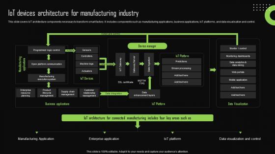 This slide covers IoT architecture components necessary to transform smart factory. It includes components such as manufacturing applications, business applications, IoT platforms, and data visualisation and control. If you are looking for a format to display your unique thoughts, then the professionally designed IoT Device Management Fundamentals IoT Devices Architecture For Manufacturing Industry IoT SS V is the one for you. You can use it as a Google Slides template or a PowerPoint template. Incorporate impressive visuals, symbols, images, and other charts. Modify or reorganize the text boxes as you desire. Experiment with shade schemes and font pairings. Alter, share or cooperate with other people on your work. Download IoT Device Management Fundamentals IoT Devices Architecture For Manufacturing Industry IoT SS V and find out how to give a successful presentation. Present a perfect display to your team and make your presentation unforgettable. This slide covers IoT architecture components necessary to transform smart factory. It includes components such as manufacturing applications, business applications, IoT platforms, and data visualisation and control.