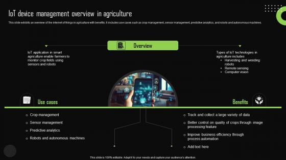 This slide exhibits an overview of the internet of things in agriculture with benefits. It includes use cases such as crop management, sensor management, predictive analytics, and robots and autonomous machines. From laying roadmaps to briefing everything in detail, our templates are perfect for you. You can set the stage with your presentation slides. All you have to do is download these easy-to-edit and customizable templates. Iot Device Management Overview In Agriculture Iot Device Management Formats Pdf will help you deliver an outstanding performance that everyone would remember and praise you for. Do download this presentation today. This slide exhibits an overview of the internet of things in agriculture with benefits. It includes use cases such as crop management, sensor management, predictive analytics, and robots and autonomous machines.