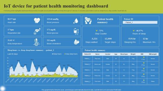 Following slide highlights dashboard that provides insights about patient health summary through IoT devices. It includes parameters such as sleep hours, step counter, heart rate etc. There are so many reasons you need a IoT Device For Patient Health Deploying IoT Solutions For Enhanced Healthcare Summary Pdf. The first reason is you can not spend time making everything from scratch, Thus, Slidegeeks has made presentation templates for you too. You can easily download these templates from our website easily. Following slide highlights dashboard that provides insights about patient health summary through IoT devices. It includes parameters such as sleep hours, step counter, heart rate etc.