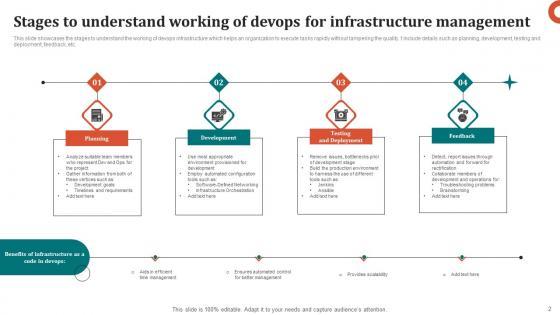 This slide showcases the stages to understand the working of devops infrastructure which helps an organization to execute tasks rapidly without tampering the quality. t include details such as planning, development, testing and deployment, feedback, etc. Pitch your topic with ease and precision using this Stages To Understand Working Of Devops For Infrastructure Management Demonstration Pdf This layout presents information on Planning, Development, Testing And Deployment It is also available for immediate download and adjustment. So, changes can be made in the color, design, graphics or any other component to create a unique layout. This slide showcases the stages to understand the working of devops infrastructure which helps an organization to execute tasks rapidly without tampering the quality. t include details such as planning, development, testing and deployment, feedback, etc.