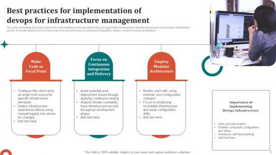 This slide showcases the best practices for implementation of devops which helps an organization to streamline disaster and recover and recreate infrastructure quickly. It include details such as make code as focal point, focus on continuous integration, delivery, employ modular architecture. Showcasing this set of slides titled Best Practices For Implementation Of Devops For Infrastructure Management Information Pdf The topics addressed in these templates are Focal Point, Focus On Continuous, Modular Architecture All the content presented in this PPT design is completely editable. Download it and make adjustments in color, background, font etc. as per your unique business setting. This slide showcases the best practices for implementation of devops which helps an organization to streamline disaster and recover and recreate infrastructure quickly. It include details such as make code as focal point, focus on continuous integration, delivery, employ modular architecture.