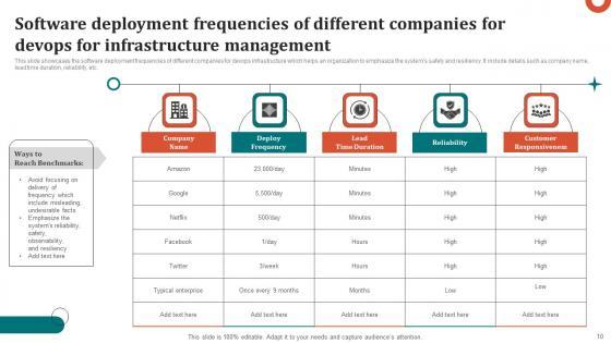 This slide showcases the software deployment frequencies of different companies for devops infrastructure which helps an organization to emphasize the systems safety and resiliency. It include details such as company name, lead time duration, reliability, etc. Showcasing this set of slides titled Software Deployment Frequencies Of Different Companies For Devops For Infrastructure Management Topics Pdf The topics addressed in these templates are Company Name, Deploy Frequency, Reliability All the content presented in this PPT design is completely editable. Download it and make adjustments in color, background, font etc. as per your unique business setting. This slide showcases the software deployment frequencies of different companies for devops infrastructure which helps an organization to emphasize the systems safety and resiliency. It include details such as company name, lead time duration, reliability, etc.