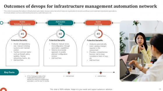This slide showcases the network infrastructure automation devops outcomes which helps an organization to enable workflows and implement repeatable applications. It include details such as scale existing resources, automate pace, etc. Pitch your topic with ease and precision using this Outcomes Of Devops For Infrastructure Management Automation Network Ideas Pdf This layout presents information on Scales Existing Resources, Automates Pace, Eases Auditing It is also available for immediate download and adjustment. So, changes can be made in the color, design, graphics or any other component to create a unique layout. This slide showcases the network infrastructure automation devops outcomes which helps an organization to enable workflows and implement repeatable applications. It include details such as scale existing resources, automate pace, etc.