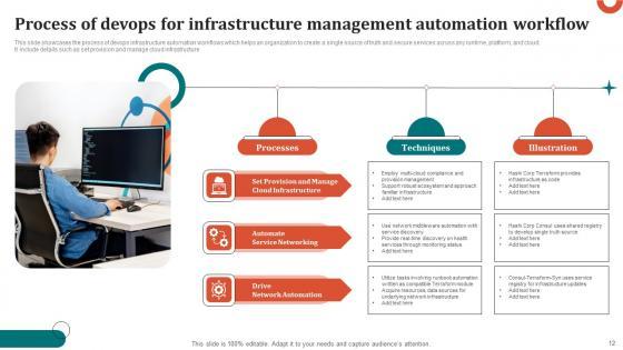 This slide showcases the process of devops infrastructure automation workflows which helps an organization to create a single source of truth and secure services across any runtime, platform, and cloud. It include details such as set provision and manage cloud infrastructure Pitch your topic with ease and precision using this Process Of Devops For Infrastructure Management Automation Workflow Mockup Pdf This layout presents information on Processes, Techniques, Illustration It is also available for immediate download and adjustment. So, changes can be made in the color, design, graphics or any other component to create a unique layout. This slide showcases the process of devops infrastructure automation workflows which helps an organization to create a single source of truth and secure services across any runtime, platform, and cloud. It include details such as set provision and manage cloud infrastructure