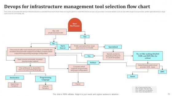 This slide showcases the devops infrastructure tool selection flow chart which helps an organization to make the choice as easy as possible. It include details such as stay with single cloud provider, prefer specialized tool, large open source community, etc. Showcasing this set of slides titled Devops For Infrastructure Management Tool Selection Flow Chart Pictures Pdf The topics addressed in these templates are Start The Process, Declarative, Programming Language All the content presented in this PPT design is completely editable. Download it and make adjustments in color, background, font etc. as per your unique business setting. This slide showcases the devops infrastructure tool selection flow chart which helps an organization to make the choice as easy as possible. It include details such as stay with single cloud provider, prefer specialized tool, large open source community, etc.
